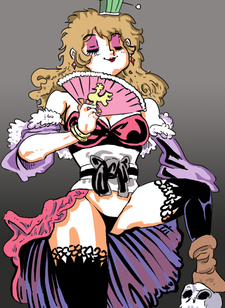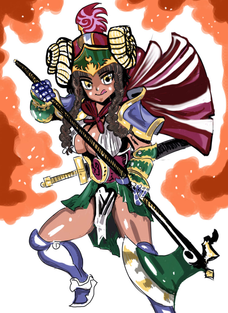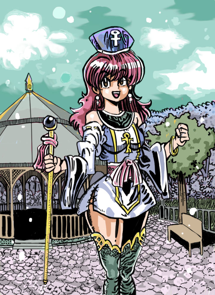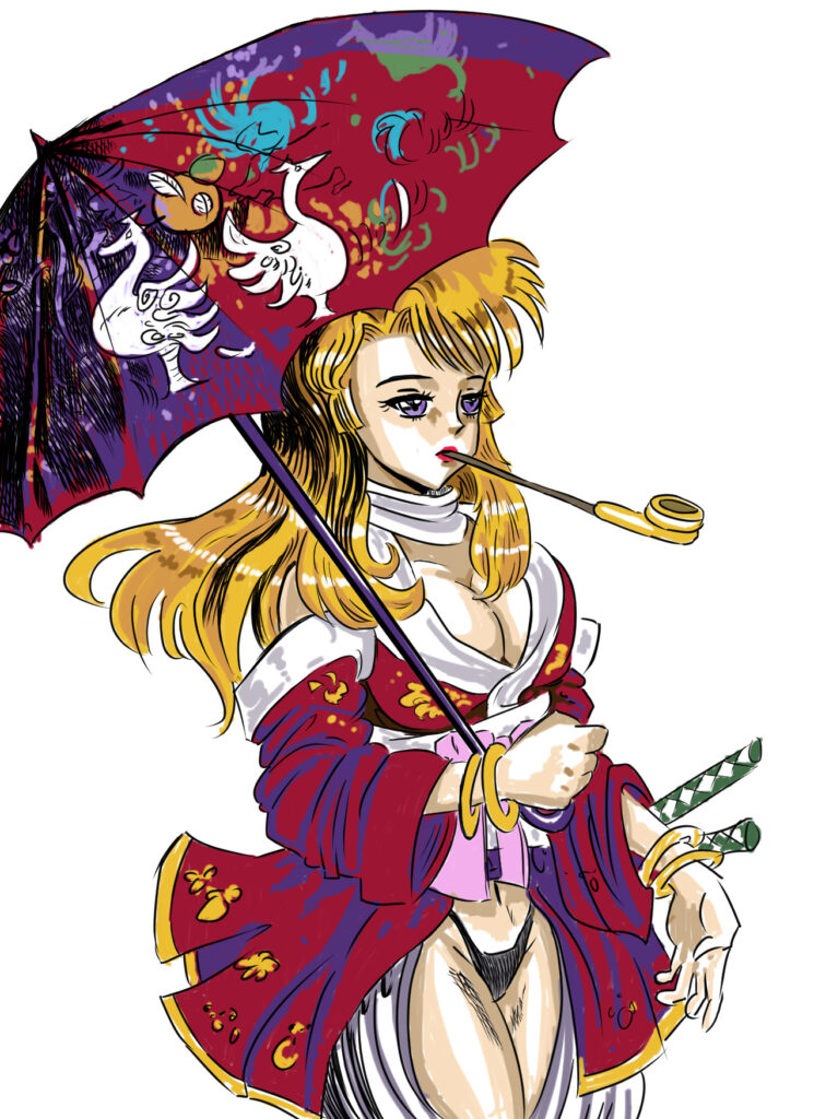 สาวผมเขียวพร้อมดาบในมือ และเปลือยกายท่ามกลางแสงจันทร์ วาดไว้นานแล้วละ เป็นอีกภาพที่เป็นงานนู๊ด วาดออกมาขึงขังดี ผ้าคลุมสีแดงอมชมพูตัดกับสีเนื้อทำให้ดูแล้วไม่เบื่อ พร้อมกับ BG ที่ดูวังเวงดูไม่ออกว่าเธอมาร้ายรึมาดี แต่ถือดาบมาด้วยแบบนี้ไม่น่าจะมาดีนะ ดูเธอฟึดฟัดเต็มทีเลยทีเดียว…